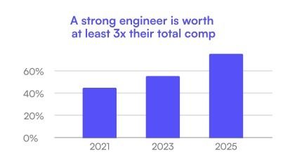 In our survey, 73% of leaders say strong engineers are worth at least 3x their total compensation. While the value of strong engineers has been increasing since 2021, the large jump from 2023 to 2025 reflects the impact of AI on productivity. Strong engineers who know how to effectively leverage AI create more value by automating routine work, accelerating development, and exploring more ideas.