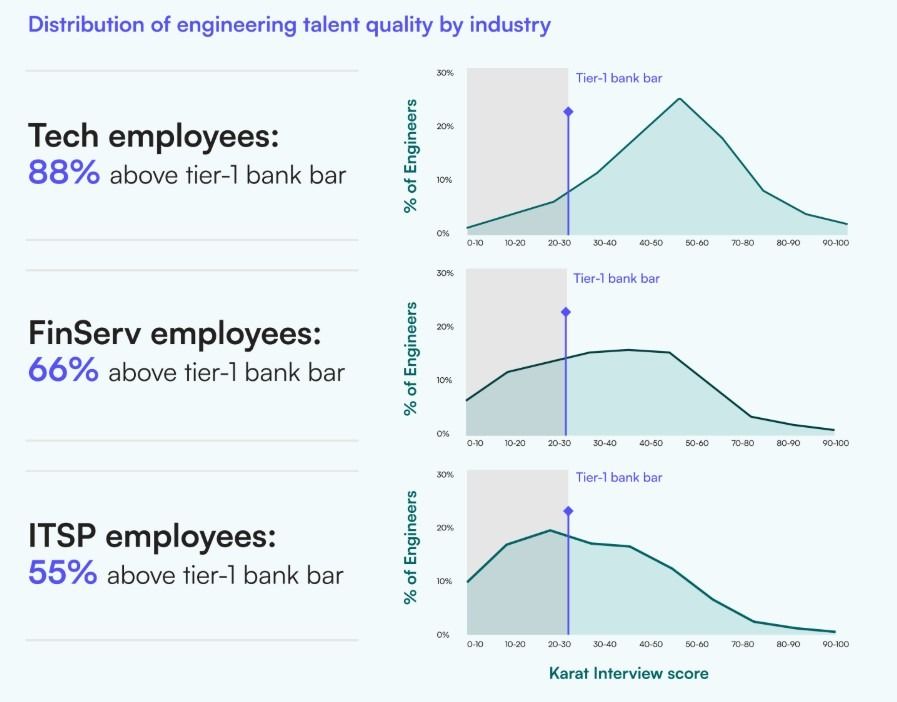 - Consistency: Many ITSPs lack consistent technical standards for who gets placed. As a result, FinServ organizations end up with engineers that don’t meet their technical bar for big banks. Our data shows that ITSP contractor quality often lags other markets, including tech and financial services. This inconsistency in talent quality makes it difficult for organizations to compete and scale their digital transformation programs.