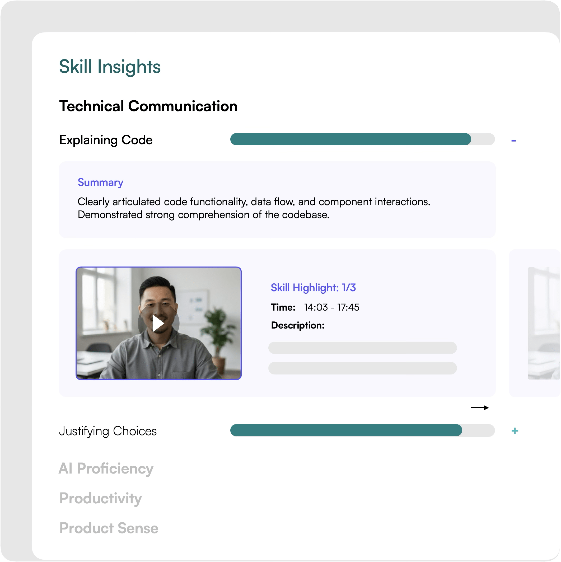 AI proficiency is part of what we evaluate, but Karat NextGen is far more comprehensive than a traditional AI skills test. It’s a holistic evaluation of real-world engineering, assessing problem-solving, technical communication, systems thinking, and how candidates leverage AI as part of their broader engineering toolkit.
