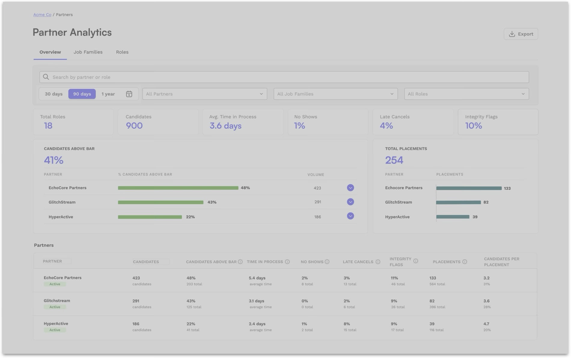 Gain visibility into IT Service Provider performance across KPIs like pass rate, placements, & time-in-process with rich insights & trends
